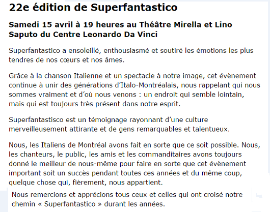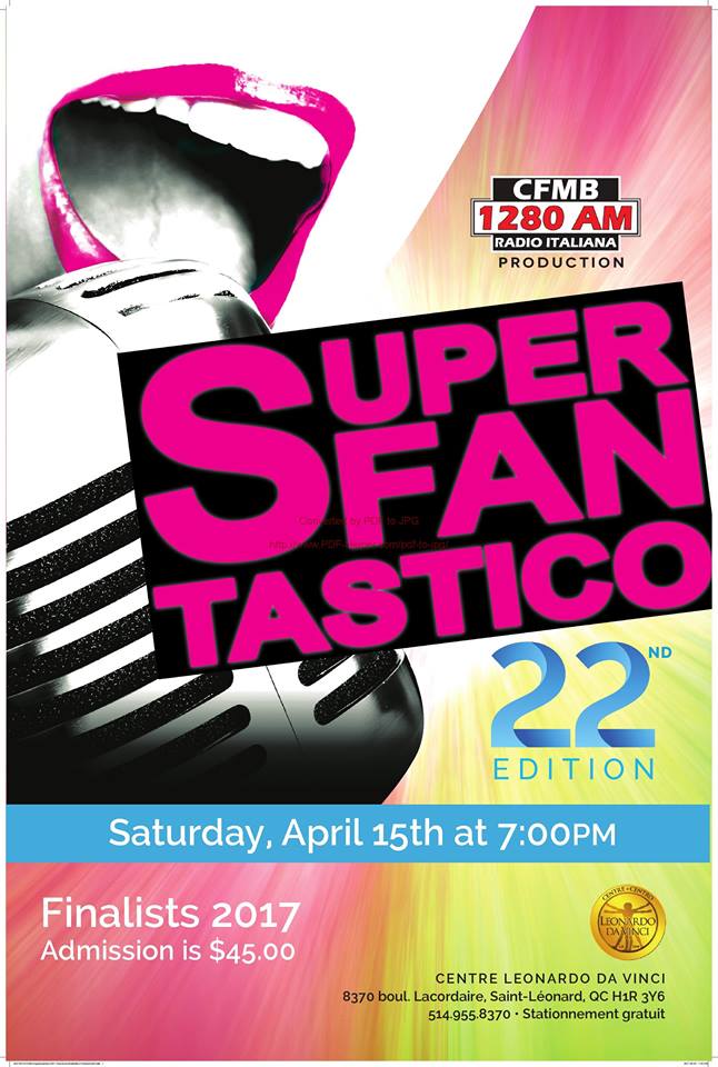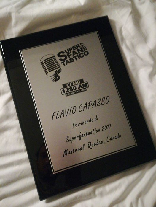 Flavio Capasso, il Vincitore del Cantagiro 2016 con il brano “Portami via” scitto insieme a Francesco Felicissimo, fa volare alto il nome di Nettuno, sua città di adozione, di Napoli, sua città di nascita e di tutta la musica Italiana. E’ in questi giorni ospite di “Superfantastico”, festival della musica italiana in quel di Montreal in Canada, grazie al gemellaggio tra i due festival. Superfantastico”, le plus grand concours de chant italien en Amérique du Nord, é uno spettacolo prodotto dalla Radio CFMB 1280am di Montreal, ideato e organizzato da Silvana Di Flavio e Nick De Vincenzo. Flavio ha ricevuto il 15 Aprile il riconoscimento direttamente dalle mani degli organizzatori i quali sono rimasti entusiasti delle sue capacità canore. Con lui, anche il Patron del Cantagiro Enzo De Carlo al quale vanno i complimenti per aver stretto una così importante sinergia. Grande la soddisfazione per entrambi per aver portato un po d’Italia in Canada.