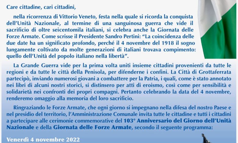 Il Comune di Grottaferrata celebra il 4 Novembre, Giorno dell’Unità Nazionale e Giornata delle Forze Armate. L’Amministrazione comunale renderà omaggio al sacrificio dei concittadini e di tutti coloro che persero la vita durante la Grande Guerra in difesa della libertà.