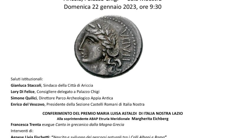 Il Dipartimento di Archeologia, creato in seno a Italia Nostra-Consiglio Regionale del Lazio, componente di Europa Nostra, ha organizzato il Convegno intitolato Le Porte verso la Magna Grecia: ultime acquisizioni sulla via Latina, la via Appia e la via Prenestina, che avrà luogo domenica 22 gennaio prossimo, nel Palazzo Chigi di Ariccia (Sala Maestra), con inizio alle ore 9,30. L’evento è patrocinato dal Comune di Ariccia.