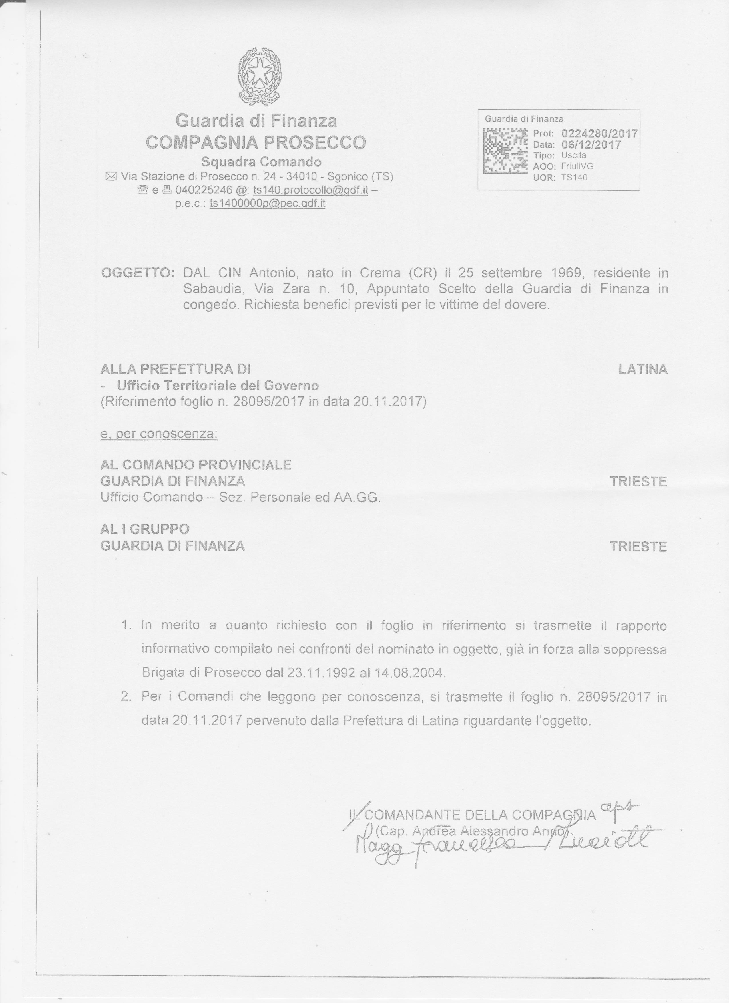 Intanto, la Compagnia della Guardia di Finanza di Prosecco (TS) in data 06/12/2017, prot. 0224280/2017, in risposta alla richiesta pervenuta dalla Prefettura di Latina – Ufficio Territoriale del Governo con foglio n.28095/2017 del 20/11/2017, trasmette un secondo “Rapporto Informativo” che l’ex finanziere ha acquisito con regolare accesso agli atti e come espressamente richiesto viene reso pubblico.