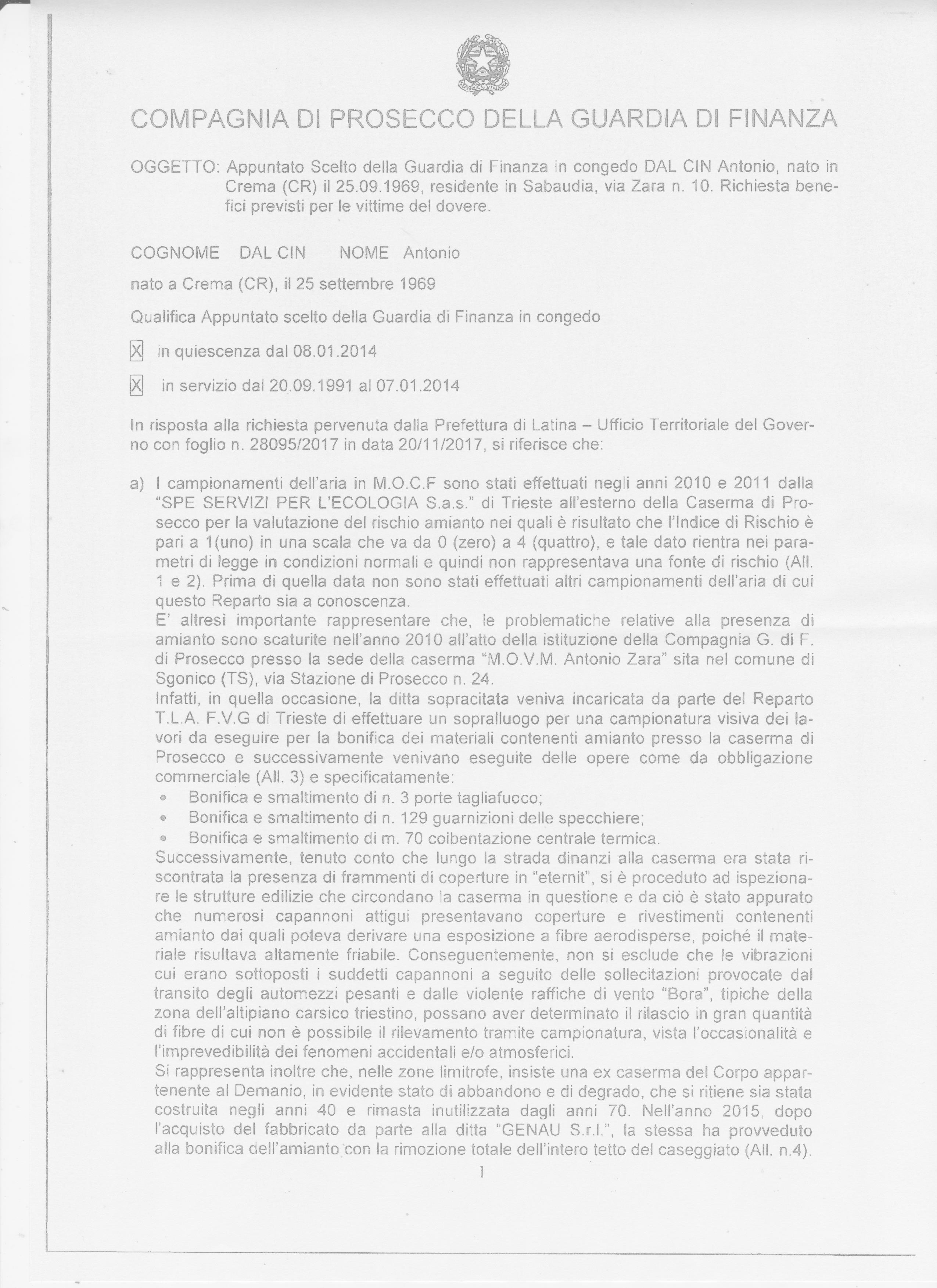 Sembrerebbe stia per avviarsi a conclusione l’iter in corso teso al riconoscimento di “Vittima del Dovere” di Antonio Dal Cin. L’ex militare della Guardia di Finanza, è affetto da “asbestosi pleurica”, patologia amianto correlata, già riconosciutagli dipendente da “Causa di Servizio”.