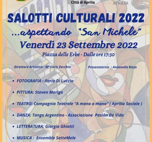 Venerdì 23 e sabato 24 settembre, presso piazza delle Erbe andrà in scena la kermesse dedicata alle arti cittadine denominata Salotti culturali 2022 – “Aspettando San Michele”. La due giorni artistica anche quest’anno, come un vero e proprio antipasto culturale, anticiperà i festeggiamenti dedicati a San Michele che avranno luogo dal 29 settembre al 2 ottobre. La rassegna, organizzata dal Comune di Aprilia in collaborazione con l’associazione Pro Loco, prenderà il via il venerdì alle ore 17 e 30 ed il sabato alle ore 18:00, vedrà una doppia direzione artistica: è affidata il venerdì al Maestro Loris Zecchin ed il sabato al Maestro Antonio De Waure.