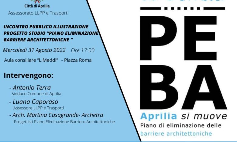 L’obiettivo è l’accessibilità degli immobili pubblici, spazi urbani, come piazze o parchi, e la fruizione dei principali percorsi pedonali in modo da formare una connessione tra le diverse parti della città di Aprilia. Interverranno: il Sindaco di Aprilia Antonio Terra; l’Assessora Luana Caporaso; gli architetti dello studio Archetra, in qualità di progettisti del piano.