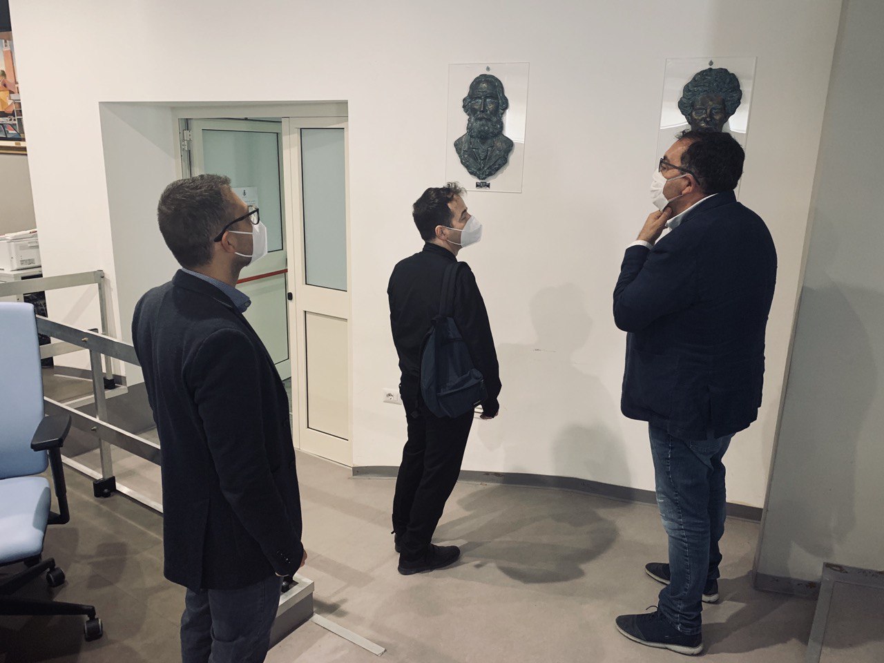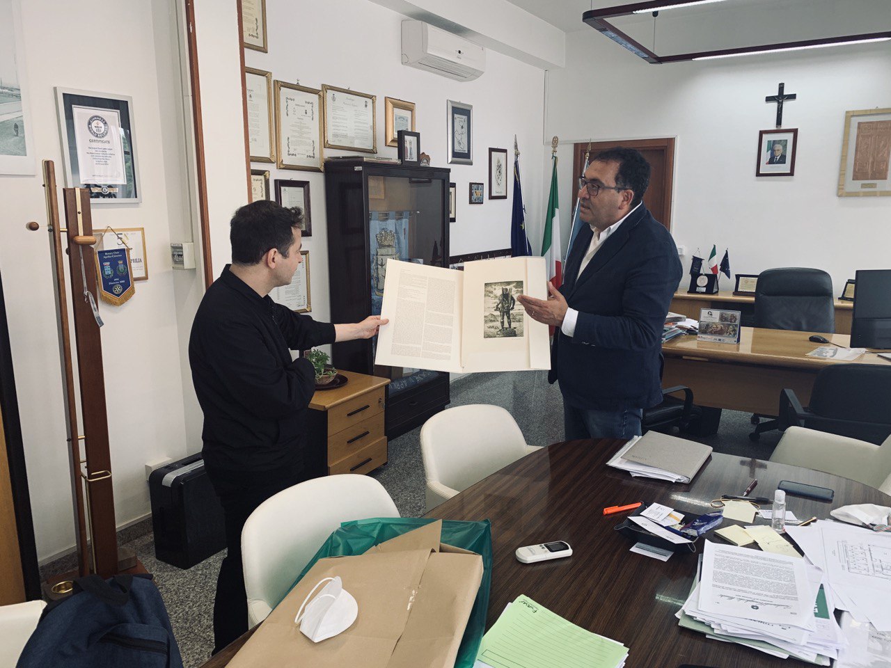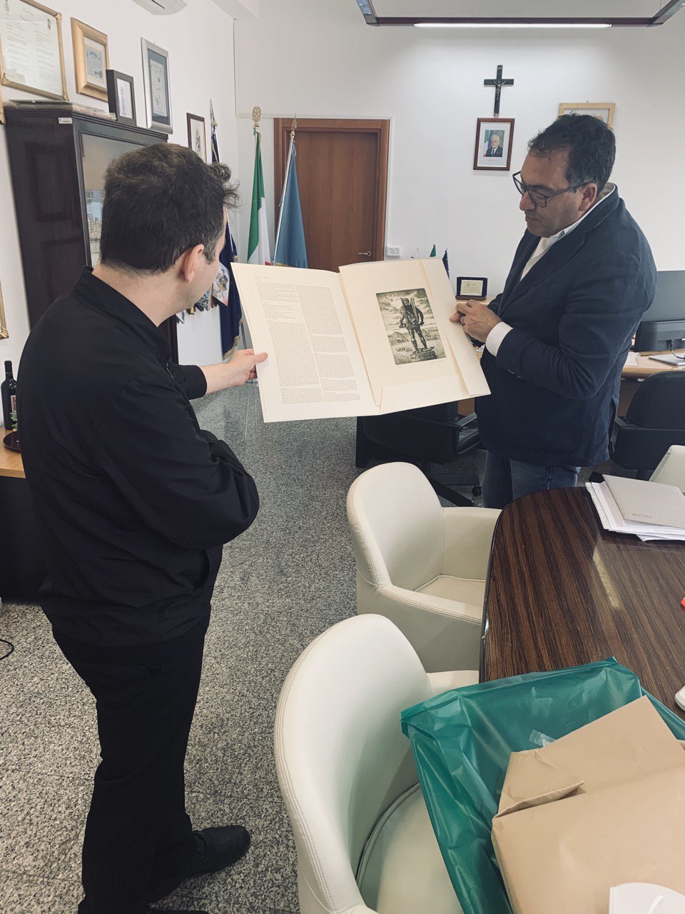 Il primo cittadino ha invece fatto dono all’araldista di un’acquaforte di Massimiliano Drisaldi che riproduce la statua di San Michele in piazza Roma