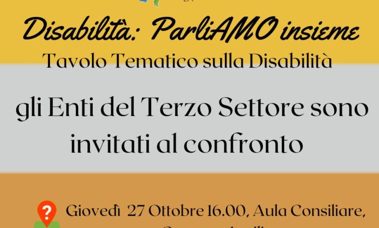 I Comuni facenti parte del distretto sociosanitario LT1, Aprilia, Cisterna di Latina, Cori e Rocca Massima, invitano gli enti del terzo settore attivi nell’ambito della disabilità, a partecipare al tavolo tematico fissato per il prossimo 27 ottobre 2022 alle ore 16:00. L’incontro, comunque aperto ai cittadini ed a tutte le categorie interessate, si terrà nell’aula consiliare “Luigi Meddi” del Comune di Aprilia in piazza Roma. Lo scopo del tavolo tematico, strumento utile alla programmazione sociale partecipata continua, è quello di condividere gli interventi e le attività previste nel Piano di zona 2021-2023, nonché quello di raccogliere contributi di conoscenza ed animare il confronto con il territorio.