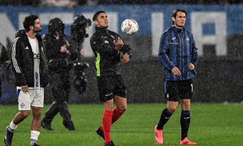 Dopo i primi due sopralluoghi il direttore di gara Tremolada, che aveva fatto i controlli del caso assieme ai due capitani, Marten De Roon e Patrick Cutrone, ha deciso dapprima di posticipare il calcio d’inizio di un’ora (alle 21.45). Poi, a causa il peggioramento delle condizioni meteo e di quelle del campo di Bergamo, sono stati effettuati altri due sopralluoghi, nei quali il pallone non rimbalzava correttamente sul manto erboso. Da qui la decisione di rinviare la gara a domani.