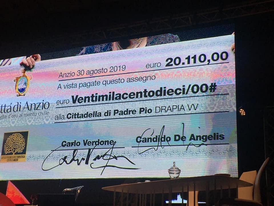 La serata è quindi volata via con risate da parte del pubblico e il sorriso di Carlo. Alla fine il tutto si è concluso con la salita sul palco di Irene Gaeta e del Sindaco Candido de Angeli. Quest’ultimo ha provveduto a consegnare l’assegno a Irene Gaeta e lei per contraccambio ha nominato Carlo ed il Sindaco “Discepoli di Padre Pio”, insignendoli del titolo e vestendoli con la toga simbolo dell’Ordine. “Grazie Carlo. Durante la mia carriera ho conosciuto moltissimi attori e personaggi famosi, ma tu sei il più grande di tutti, perché loro mi hanno sempre aiutato con le parole, mentre tu sei il primo che mi ha aiutato con i fatti”.