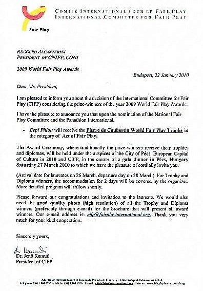 SU PROPOSTA DEL COMITATO NAZIONALE ITALIANO FAIR PLAY, L’INTERNATIONAL COMMITTEE FOR FAIR PLAY, PRESIEDUTO DAL PLURIMEDAGLIATO DELLA SCHERMA, OLIMPIONICO, JENO KAMUTI, HA ASSEGNATO A BEPI PILLON IL PRESTIGIOSO “PIERRE DE COUBERTIN WORLD FAIR PLAY TROPHY”. LA CERIMONIA DI CONSEGNA A PEC (UNGHERIA) CAPITALE EUROPEA DELLA CULTURA, IL 27 MARZO.
