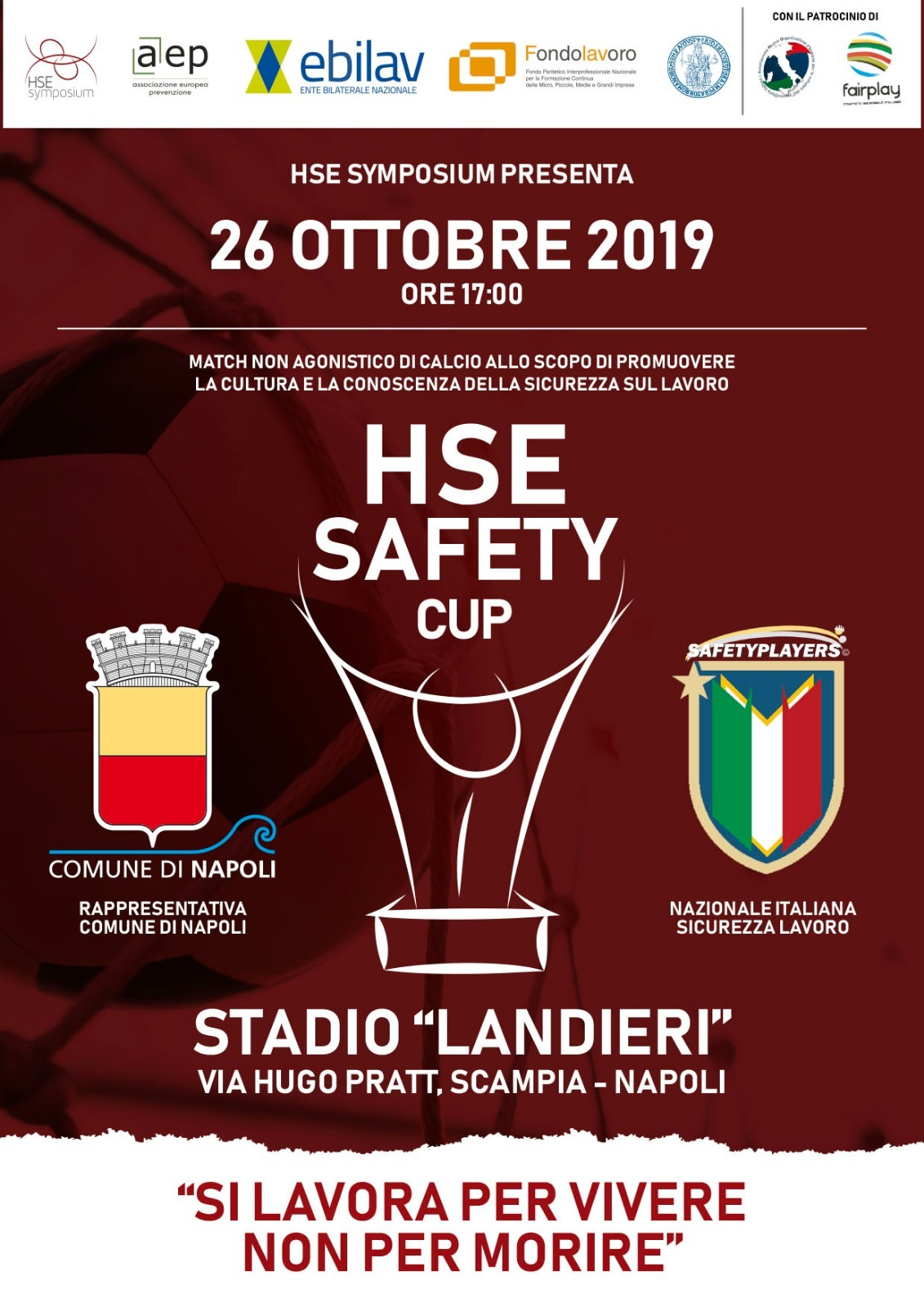 La sicurezza in campo ha vinto la prima edizione della HSE Safety Cup di calcio a 11 disputata oggi, sabato 26 ottobre, allo stadio Landieri di Napoli Scampia. Il match non agonistico di calcio è finito con il risultato di 2 goal a zero, con reti di Mastropasqua e Mingolla, ma con grande soddisfazione da parte di tutti quanti hanno organizzato l’incontro allo scopo di promuovere la cultura e la conoscenza della sicurezza sul lavoro. Al debutto di questo simposio, hanno preso parte solo due squadre: la Nazionale della sicurezza e la rappresentativa del Comune di Napoli. Il torneo patrocinato dal Comitato Nazionale Italiano Fair Play presieduto da Ruggero Alcanterini, in collaborazione con l’Osservatorio Nazionale Amianto presieduto da Ezio Bonanni, ha chiuso la settimana dedicata al Fair Play, iniziata con la Fair Play Cup a Roma sabato scorso, vinta dalla selezione romana della Nazionale di calcio dei Vigili del Fuoco proprio sulla Nazionale della sicurezza. La partita disputata a Napoli Scampia oggi è stata organizzata al termine del HSE Symposium dal comune di Napoli e da Associazione Europea per la Prevenzione presieduta da Vincenzo Fuccillo, Fondolavoro e Ebilav Ente Bilaterale Nazionale.