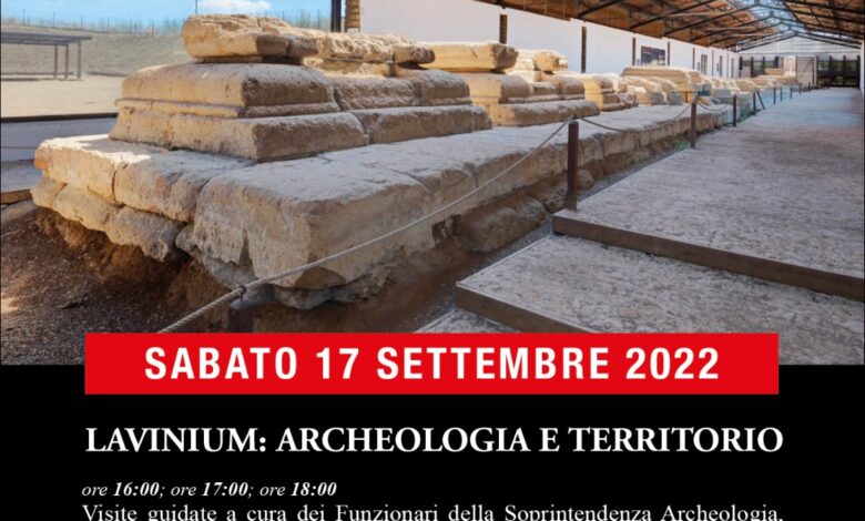 Sabato 17 settembre i Funzionari della Soprintendenza Archeologia Belle Arti e Paesaggio per l’Area Metropolitana di Roma e la Provincia di Rieti, Francesca Licordari e Gabriella Serio, e la Direttrice del Museo, Federica Colaiacomo, accompagneranno i visitatori alla scoperta dell’Area Archeologica dei XIII Altari e dell’Heroon di Enea. Le visite guidate partiranno alle 16, alle 17 e alle 18 dal Museo Civico Archeologico Lavinium.