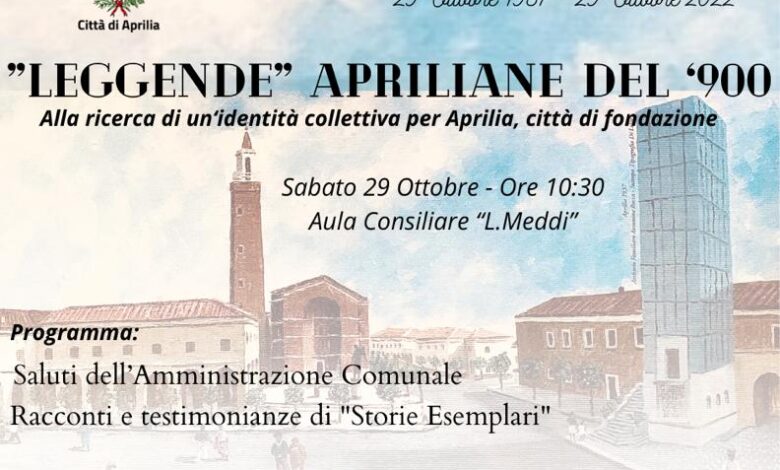 L’amministrazione comunale, in occasione dell’85esimo anniversario dell’inaugurazione della città di Aprilia, invita la cittadinanza a partecipare alla celebrazione della mattinata denominata “Leggende apriliane del ‘900” che si terrà sabato 29 ottobre dalle ore 10.30 presso l’aula Consiliare Luigi Meddi. L’iniziativa oltre ad omaggiare l’evento inaugurale della città di fondazione, avvenuto il 29 ottobre del 1937, guarda alla ricerca dell’identità collettiva del territorio apriliano con una serie di racconti e testimonianze esemplari.
