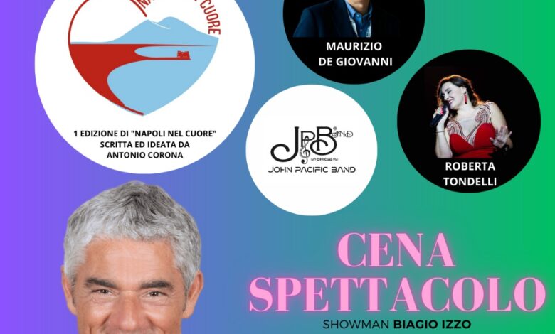 Al via la prima edizione di Napoli Nel Cuore, la cena spettacolo targata Napoli che avrà luogo sabato 8 luglio alle ore 21.00, al Ristorante Braceria Kaldera 538, in via Montenuovo Licola Patria 83. L’evento, ideato e organizzato da Antonio Corona per celebrare la città di Partenope, in un anno di grande rinascita, avrà come protagonisti Biagio Izzo, Maurizio De Giovanni, Roberta Tondelli e la John Pacific Band. La serata sarà presentata da Maria Silvia Malvone, con le interviste nel backstage di Lorenza Licenziati.