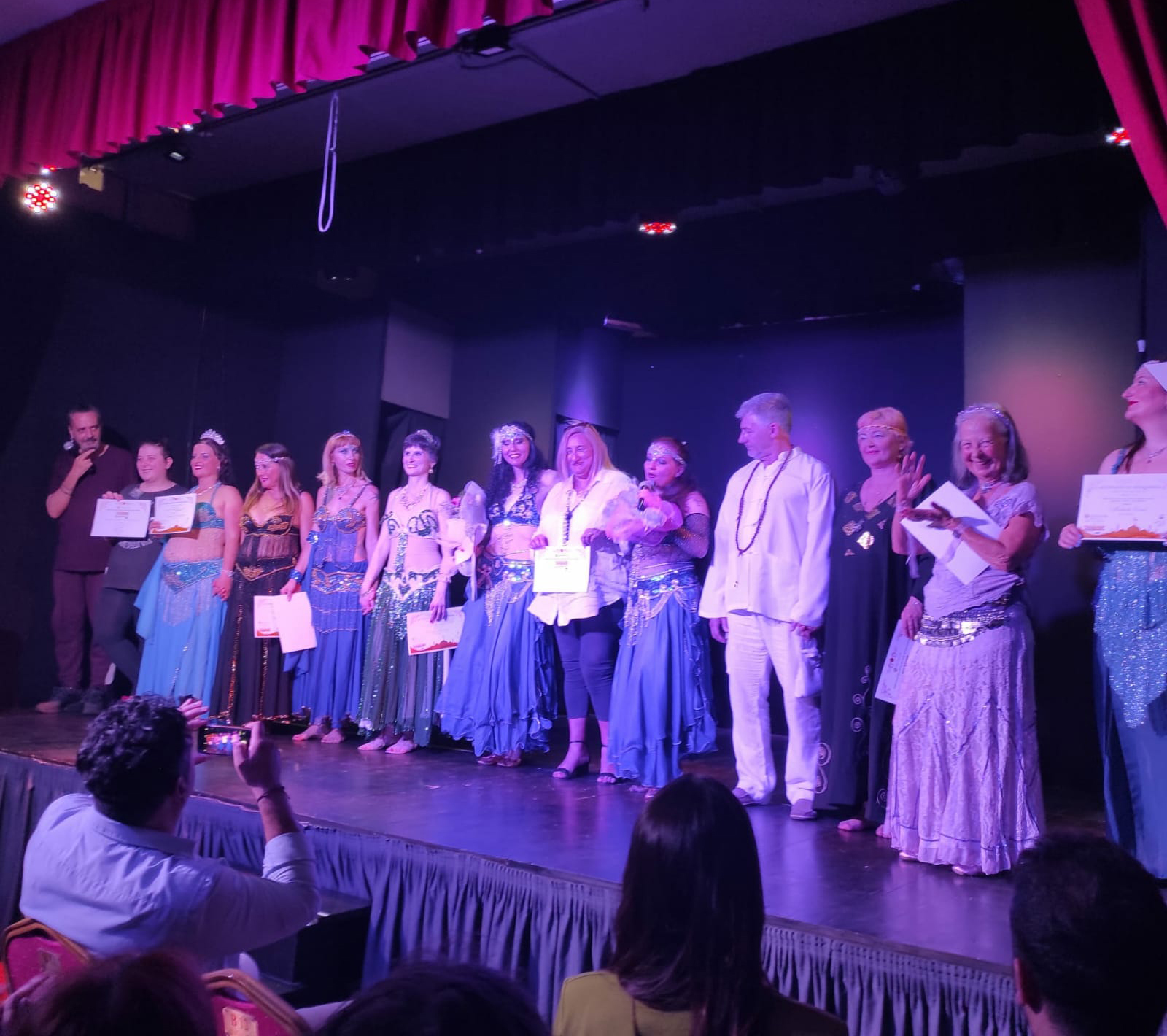 Ritmi scanditi dalle entrate alternate in scena di Marzia Gaddi e Roberto Petriconi, gli operatori olistici che hanno interpretato con vari strumenti le varie sonorità dalle percussioni dei Tamburi Sciamanici al Bastone della Pioggia, quest’ultimo è un tipico strumento probabilmente uno dei primi strumenti che l’uomo abbia inventato per riprodurre il suono naturale della pioggia. Questo strumento viene fatto risalire alle zone del Sud America, ma anche dell’Africa e Australia, a conferma di come queste pratiche siano state utilizzate in ogni parte del mondo. Il magico cammino danzante in continuo divenire ha poi cambiato l’intensità quando la scena si è evoluta entrando nel vivo del mondo orientale con tipiche scene arabe di mercato tra veli colorati, stoffe ed accessori. L’entrata di nuovi ritmi e stili di danze tradizionali come Saidi Tahtib o Raqs el Assaya nota come la Danza del Bastone. Il gran finale è stato interamente dedicato alla danza classica orientale Raqs Sharqi con un omaggio coreografico della famosa Star mondiale della Danza Orientale Jillina Carlano. Concluso lo spettacolo sono seguite le attestazioni alle allieve ed i vari ringraziamenti alla presenza della Dott.ssa Paola Bruni Presidente Opes Benessere Italia che crede in ogni progetto ideato dalle sorelle Malizia ed anche quest’anno ha ribadito il concetto dello studio approfondito antropologico alla base di questi saggi spettacolo. Ringraziamenti speciali da parte di Natascia e Romina: “Grazie a tutto il pubblico presente, parenti ed amici che hanno letteralmente inondato il teatro, in primis le nostre allieve che hanno creduto in noi e nel nostro progetto di saggio spettacolo proprio come lo scorso anno per Holistic Bellydancer Show. Marzia e Roberto, gli operatori olistici che hanno interpretato con vari strumenti le varie sonorità; Laura Casella Presidente Associazione Lavinia Litora, il M° Fabio De Angelis e l’intero Coro Lavinia Litora che ha donato un valore artistico aggiunto allo spettacolo. Il nostro regista Giampiero Bonomo e l’intero Teatro studio 8 che ha accolto con entusiasmo il progetto, la Presidente Opes Benessere Paola Bruni sempre presente; lo staff del backstage Rosa Cinti ed il nostro fotografo Giulio Anelli. Grazie a tutti dal profondo del cuore, dedicato ai nostri genitori felicemente in sala ad applaudirci!” . Pubblico emozionato e sbalordito, scene e fusioni inaspettate, una nuova tipologia di spettacolo già richiesto in molti teatri d’Italia.