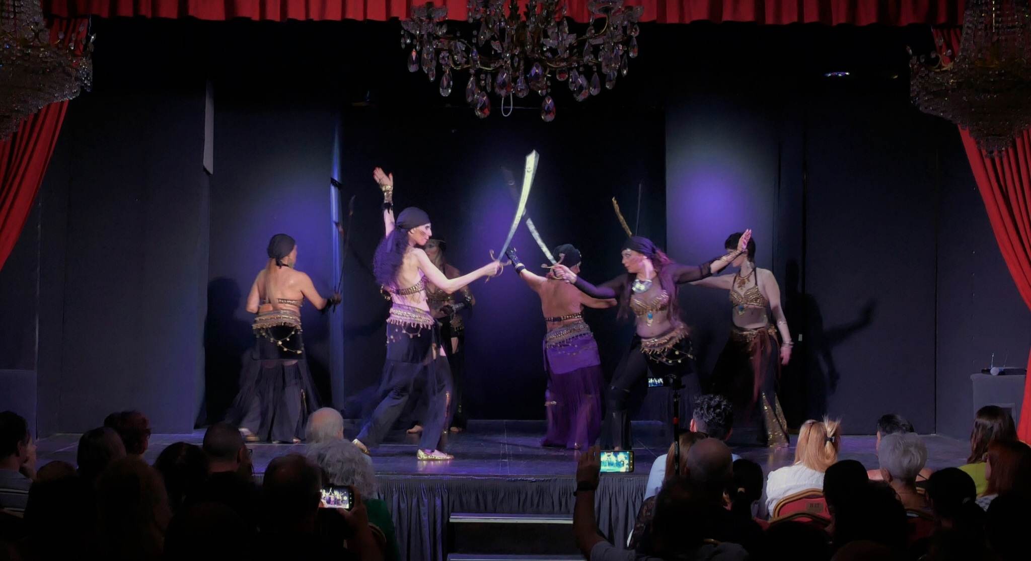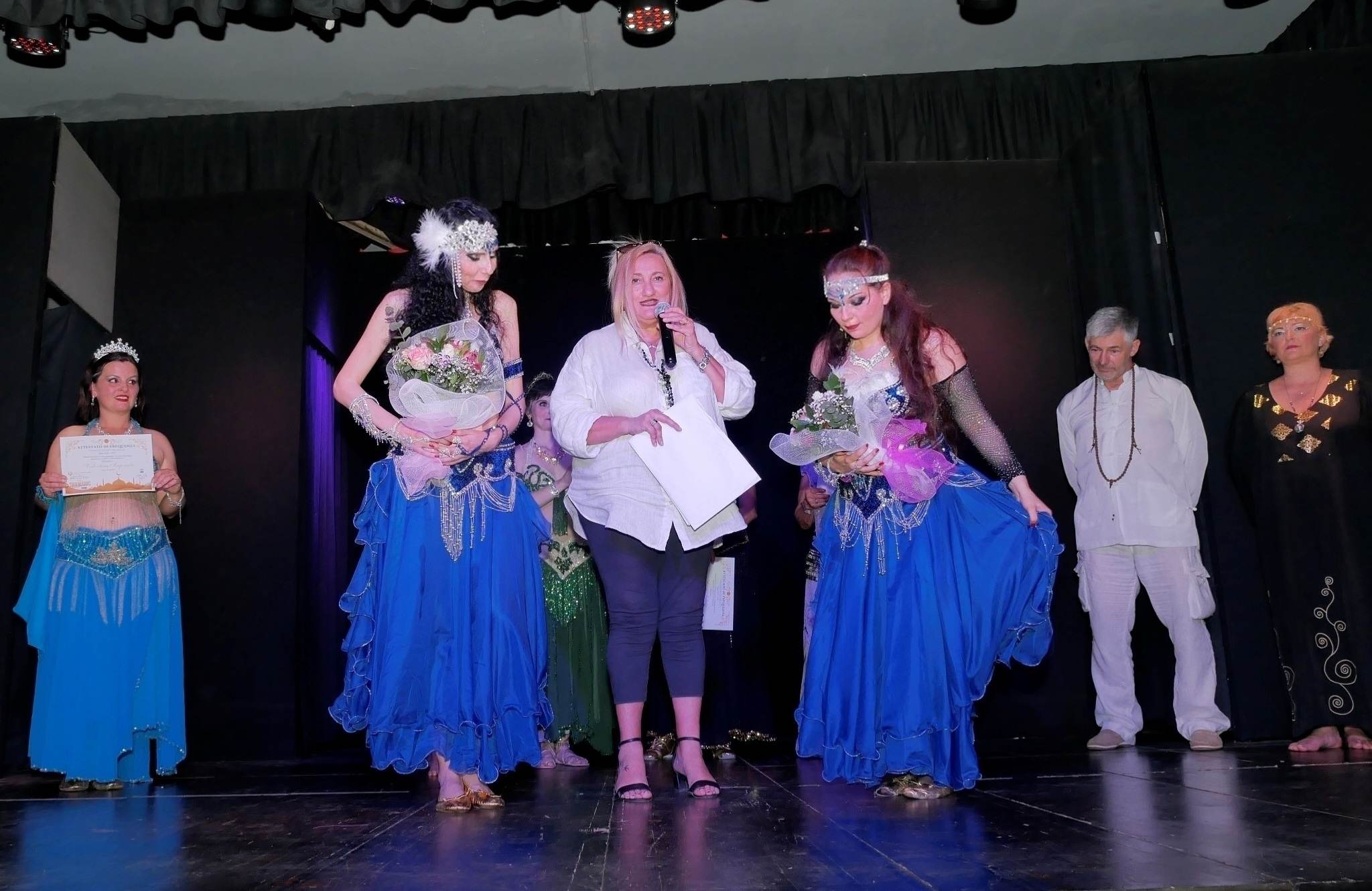 Un successo inaspettato per Shamanic Bellydancer Show, il saggio spettacolo ideato e coreografato da Natascia e Romina Malizia, (Diploma Nazionale Opes Benessere Danza Awalim – Danze Mediorientali – Ente Ric. C.O.N.I.), andato in scena per la prima volta venerdi 2 giugno presso il Teatro Studio 8 di Nettuno per la Regia di Giampiero Bonomo ed un primo sold out. Uno spettacolo ricco di colori sonorità e simbologie. E’ stato come vivere in un sogno, un viaggio Sciamanico, una trasposizione artistica che nasce da lontano, la volontà di fondere gli aspetti benefici delle sonorità olistiche a quelli della Danza Mediorientale più comunemente conosciuta come Danza del Ventre. Ritmi e suoni che evocano la natura attraverso strumenti olistici, dai Tamburi Sciamanici alle Campane Tibetane al Bastone della Pioggia. Sonorità che hanno incantato. Il viaggio sciamanico è iniziato per la prima in assoluta, con l’intervento esclusivo del Coro dell’Associazione Culturale Lavinia Litora diretto dal M° Fabio De Angelis. Il Coro ha interpretato due brani emozionando tutto il pubblico, “Evening Rise” (traditional american indian) ed “Eatnemen Vuelie” (canto popolare Yoik). La prima coreografia è stata interamente ispirata agli Indiani d’America, in versione Tribal Fusion Dance dove ogni danzatrice impersonificava un Animale Totem (in assoluto il Lupo) e l’ispirazione del Mondo della Natura (dal movimento dei rami di un albero al vento). Questo viaggio intenso si è poi evoluto con l’entrata delle “Guerriere” con la Danza della Spada Raqs al Saif (altra Danza tipica Orientale) fusa allo stile Tribal, un assolo di Natascia e Romina e le loro allieve Awalim le Danzatrici di Iside (Paola Canestri, Melanie Tommasini, Laura Silvestri, Valentina Imperato, Michela Cinti e Lucia Sabetta).