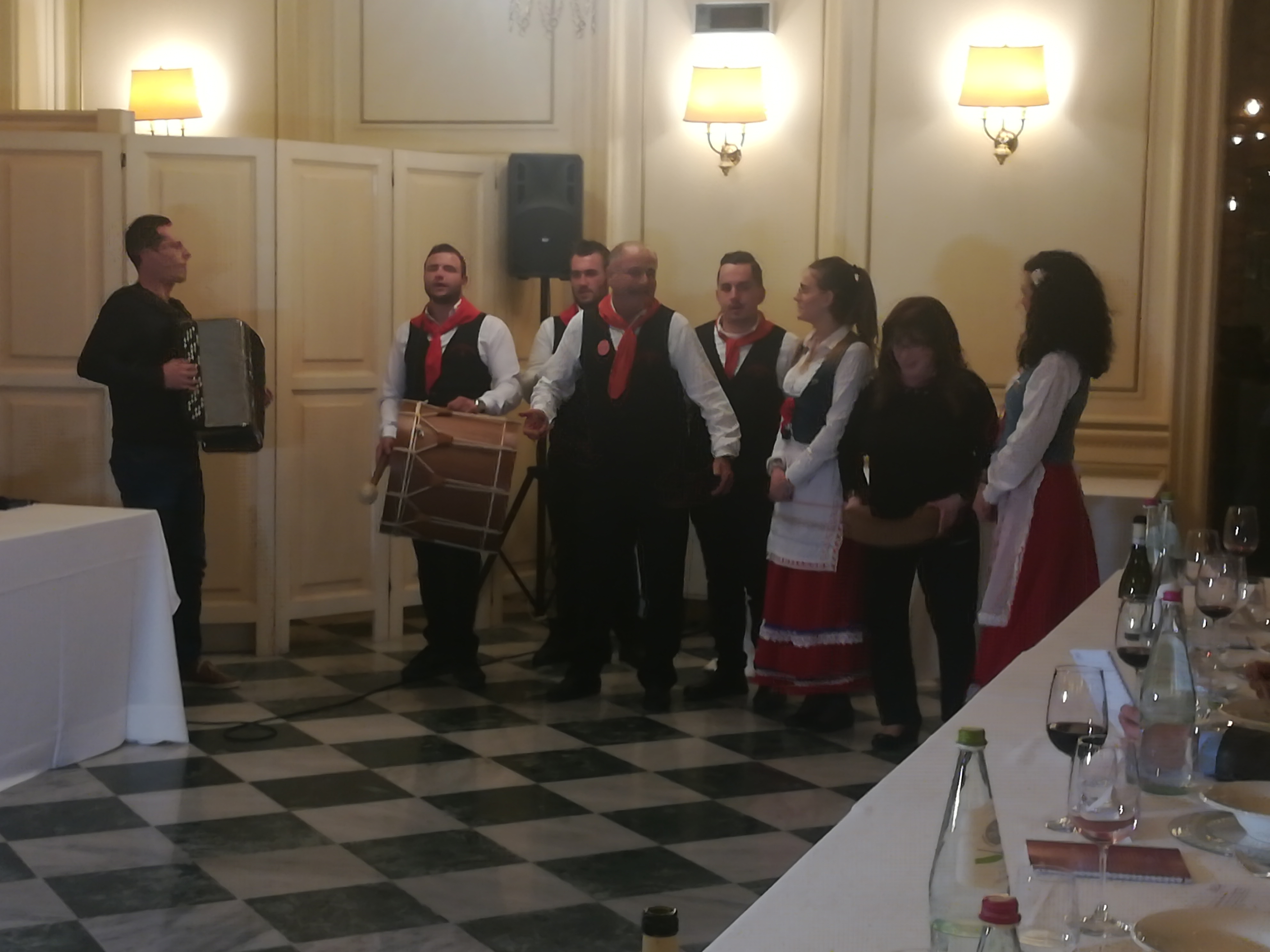 Chi non la conosce tenga presente che si tratta della rievocazione del più alto conviviale abruzzese: 50 portate tra antipasti, brodi di gallina, pasticci, timballi, carni arrosto, verdure, formaggi, salumi, frutta e dolci. Ma qui, dove la terra di confine può apparire ruvida, proprio qui, dove talvolta i piedi tremano, nel cuore di uno dei 700 castelli tra i più belli al mondo. c’è una sentinella a fare da testimone a un tour gastronomico che già al debutto, mantiene una promessa: non lasciarvi a bocca asciutta! Preparatevi a un percorso gastronomico di 4 ore, ma la scoperta dei sapori tipici che farete è in sostanza fatto di quel patrimonio umano che gli abruzzesi sanno donare. Non pensate di scegliere il vicino di tavolata. Guai. Ci pensa la sorte. Prima di entrare in sala, dovete pescare il vostro numero di posto. Il resto vien da sé. Davanti a voi non c’è nessuno. A parte posate, un piatto, due bicchieri per acqua e vino essendo il pane non previsto nel convivio anticipato durante l’Abruzzo Food Experience guidato dalla Camera di Commercio, Industria, Artigianato e Agricoltura Chieti Pescara. In linea con la tradizione locale, la Panarda è un’esaltazione del cibo e delle tradizioni che celebra la fatica dell’uomo, glorifica valori anche non cristiani e onora Sant’Antonio Abate, patrono degli animali da cortile. Solo che all’alimentazione in voga fino ai primi del ‘900, fatta di legumi, granoturco, frumento, verdure e pasta fatta in casa, è stata aggiunta la variante della carne, per lo più pollo e maiale. A prescindere dall’etimologia incerta che fa derivare la parola dal matrimonio a tavola del pane con il lardo, sta di fatto, comunque, che la Panarda consisteva un tempo e consiste dal 28 novembre, in un pantagruelico banchetto di cibi considerati rari e preziosi. Prendendo le distanze dalla ricorrenza del 17 gennaio in funzione devozionale del Santo Antonio Abate, così come dalla voglia di allontanare la miseria dalla tavola delle famiglie più povere attraverso l’offerta di questo banchetto da parte dei ceti più facoltosi, c’è di bello che l’annata si presenta più che florida nel guardare il menu. Prima di arrivare ai sassi d’Abruzzo (dette anche mandorle “atterrate”) ricoperti da zucchero fuso che, una volta caramellato sulle mandorle le rende somiglianti a piccole pietruzze scure, e prima di fermarsi alle Sise delle monache di Guardiagrele, un dolce abruzzese celestiale, la strada è lunga. Passa per la cozza vastese, la tiella di alici e patate, il brodo di Natale alla chietina, la salsiccia secca di fegato, la sprisciocca e ancora. Perché già contare fino a 50 portate e arrivare alla fine della Panarda per lasciarsi andare al saltarello, ce ne vuole di tempo che scorre. A scandirlo ci pensa il “maestro di Panarda” (per noi era Claudio Ucci direttore Consorzio Abruzzo Travelling) a fare la regia dell’evento fortemente voluto dalla Camera di Commercio di Chieti Pescara. È lui che presenta le pietanze annunciate da un colpo secco di tamburo. Ed è lui che ha scelto il momento giusto per far entrare in scena il Gruppo Orchestra Popolare del Saltarello diretta da Danilo Di Paolonicola. Loro, affiatati e divertiti, ballano in cerchio, in coppia, in file contrapposte, a croce e in qualsiasi direzione. Sempre loro cantano e ritmano la serata che alterna pietanze a danze, canzoni e brindisi inventati al momento, dove a improvvisare potresti essere proprio tu che stai leggendo questo articolo. Perché a scegliere chi deve alzare i calici e dare il beneaugurante augurio ai presenti, è sempre un componente dell’orchestra del Saltarello. Suona l’organetto fino a quando, come una mannaia, la nota musicale si interrompe dietro alla sedia del prescelto che deve inventare un pensiero per i presenti al banchetto, alzando in alto il calice pieno di vino. Ma non finisce qui. Può capitare (e capita) che dopo l’esibizione di “Mare Maje” resa nota da Lina Wertmüller nel 1973 con il “Film d’amore e d’anarchia”, faccia il suo ingresso davanti a voi anche il “guardiano di Panarda”. Non ha il fucile ma è armato di mattarello e controlla che tutti mangino tutto, con la frase minacciosa “magne”!!! Ovviamente è uno scherzo, ma va da sé che i piatti tornano bianchi in cucina.