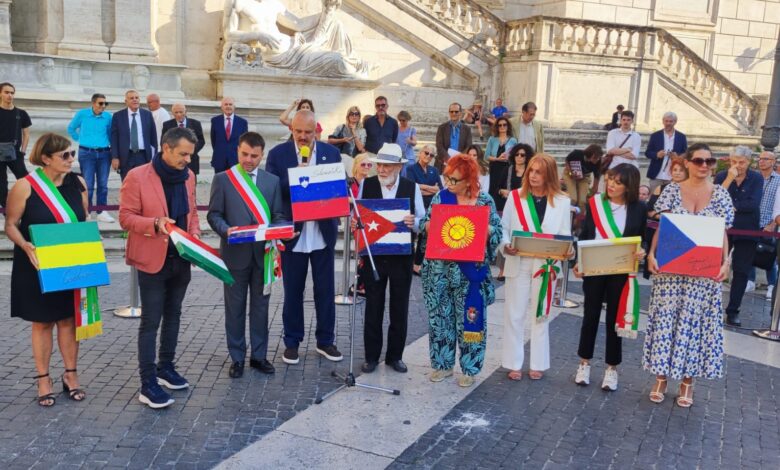 La seconda edizione di Insieme Siamo Arte. La Città metropolitana tra cultura e sociale, nata dalla collaborazione tra Città metropolitana e ATCL, circuito multidisciplinare del Lazio sostenuto da MIC – Ministero della Cultura e Regione Lazio, si apre con un evento d’eccezione aperto alla cittadinanza. Oggi in Campidoglio gli artisti Michelangelo Pistoletto e Angelo Savarese hanno fuso le loro filosofie artistiche e poetiche nella realizzazione di un’opera che incrocia il noto simbolo del Terzo Paradiso di Pistoletto, formula della connessione di tutti gli elementi, di equilibrio e di condivisione, con il progetto “Flags” di Savarese, che reinterpreta le bandiere dei 196 Stati aderenti all’ONU, dove ogni territorialità si unisce in un unicuum di connessione. “1 + 1 = 3” lo slogan del progetto, che sottolinea come gli incontri tra le differenze producano risultati superiori, per arricchimento e inclusività, rispetto alla semplice somma dei singoli. Sotto gli occhi di tutti, la composizione in live performance di un’opera d’arte collettiva e dalla forte valenza simbolica. Le bandiere dei diversi Paesi sono state collocate sugli appositi supporti che disegnano la struttura continua e infinita del Terzo Paradiso, formando un’unica, grande bandiera, nel segno della fratellanza e della solidarietà. La performance è stata preceduta dall’incontro in Aula Giulio Cesare con gli interventi dei due artisti, dei curatori Francesco Saverio Teruzzi, della Fondazione Pistoletto, e Fortunato D’Amico, dei Consiglieri di Città metropolitana Tiziana Biolghini e Mariano Angelucci, alla presenza delle rappresentanze diplomatiche invitate, dei Comuni metropolitani e dei Municipi di Roma, con la proiezione in apertura del video di Andrea Rusich.