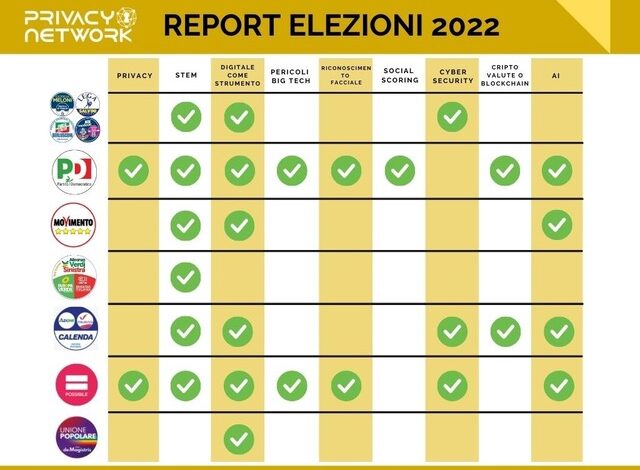 Un’attenzione particolare è stata data ai dati personali e alla privacy, un tema che riguarda ognuno di noi e che tocca anche lo sviluppo delle aziende e del paese. Come spiega Diego Dimalta, avvocato, Co-fondatore dell’Associazione Privacy Network: “una società tecnologica e libera si regge sulla responsabilità di tutti, legislatori, aziende e singoli utenti. Tematiche come cybersecurity e privacy devono essere capite e presidiate in tutti i contesti: al lavoro, a scuola, in famiglia ma soprattutto in politica. È un tema che sarà sempre più centrale nella vita quotidiana di ognuno di noi e purtroppo, in generale, si parla poco di diritto all’uso delle tecnologie come anche di tutela dei diritti delle persone nei confronti delle grandi piattaforme o nei confronti dell’uso incontrollato di sistemi di intelligenza artificiale, come ad esempio dei cosiddetti sistemi di decisione automatica utilizzati soprattutto dalle PA. È per questo che per ogni programma abbiamo cercato di evidenziare i punti legati al mondo delle nuove tecnologie e individuare aspetti positivi e negativi delle scelte operate da coalizioni e partiti, nella speranza che il risultato possa essere utile al fine di decidere in modo più consapevole.”