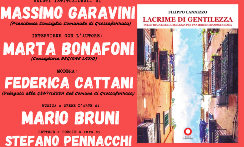 Sabato 12 Novembre 2022, ore 18:00, a Grottaferrata (Rm) nella splendida cornice di presso Palazzo Grutter (Piazzetta Francesco Zacchi, 20), si terrà la presentazione del libro del filosofo Filippo Cannizzo:”Lacrime di Gentilezza. Sulle tracce della bellezza per una (ri) generazione umana”. L’iniziativa è inserita nella rassegna letteraria “libri, arte, cultura” curata da Veronica Pavani.