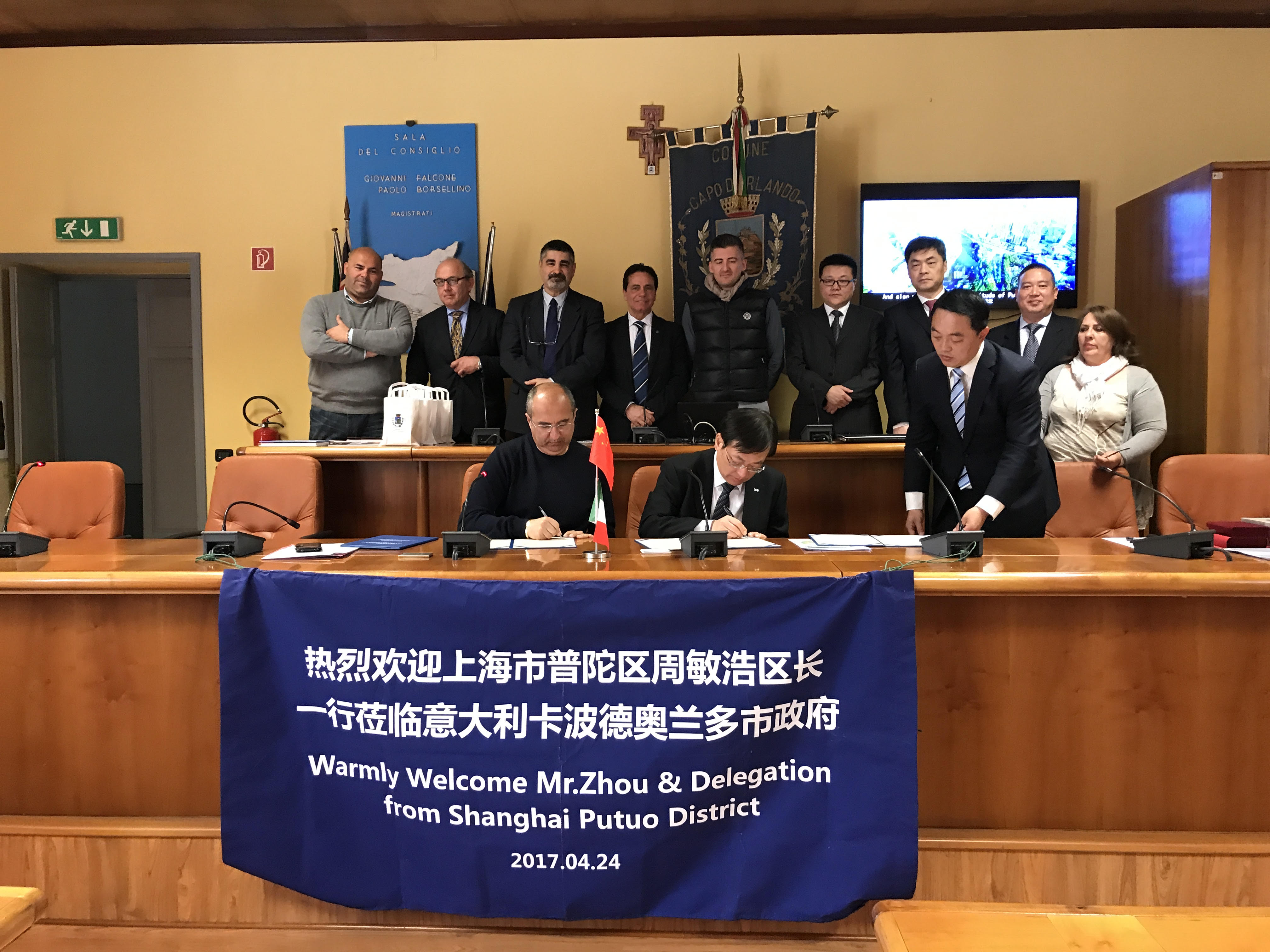 Antonio Geracitano è rimasto in Italia per ricevere e ufficializzare con i Sindaci di Putuo- Shangai e di Capo d’Orlando – Messina . il protocollo d’intesa tra le città per il gemellaggio economico culturale che ha visto la cerimonia ufficiale svolgersi lunedi’ mattina 24 aprile nella sala consiliare della città turistica di Capo D’Orlando. Erano presenti in veste di delegati ufficiali per conto dell’Associazione A.P.G.I. , Orazio Anania, Presidente Associazione Apoxiomeno , Mino Maisto di China Time e la sottoscritta. Per l’amministrazione di Capo D’Orlando oltre il Sindaco Franco Ingrillì ,erano presenti l’Assesssore al Turismo Rosario Milone e il Presidente del Consiglio Comunale Carmelo Galipo‘.