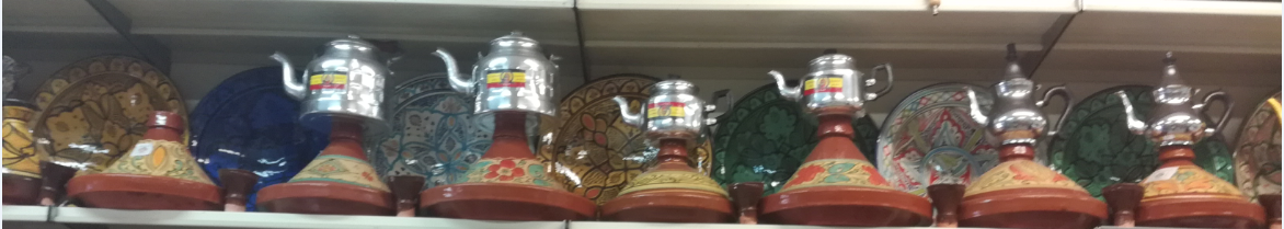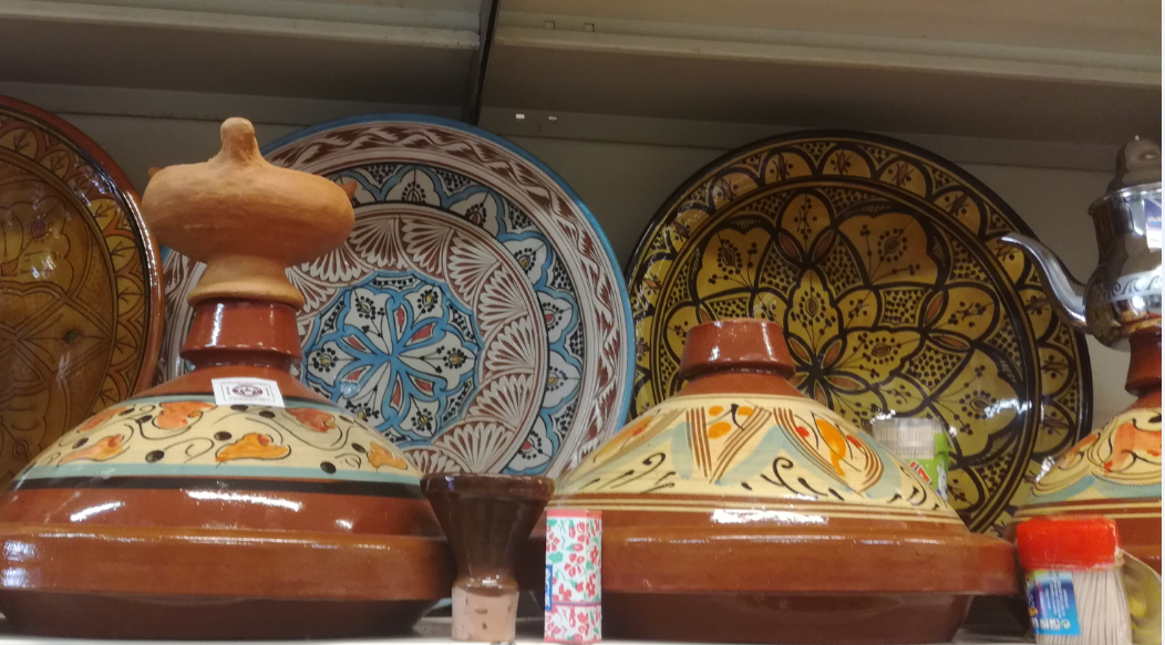 Il coccio a forma di cono che chude il vassoio sempre di terra cotta , dal nome tajin , denomina molte pietanze che comprendono legumi ortaggi  verdure e anche frutta come le prugne e le albicocche secche che diventano   contorni  alle  portate di carne o pesce. Il tajin viene collocato al centro del tavolo e mangiato dai commensali con del pane senza posate.A seguire sui divani a seduta araba nelle case tra le preghiere e le pietanze si fumano i narghilè le pipe ad acqua oramai molto conosciute anche da noi.