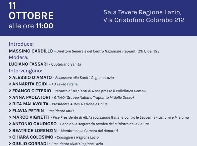 I lavori del convegno saranno introdotti da Massimo Cardillo, Direttore Generale del Centro Nazionale Trapianti (CNT) dell’ISS. Fra i relatori invitati ad intervenire, Alessio D’Amato, Assessore Sanità Regione Lazio; Annarita Egidi, AD Takeda Italia; Franco Citterio del Reparto di Trapianti di Rene presso il policlinico Gemelli; Anna Paola Iori, gruppo GITMO (Gruppo Italiano Trapianto Midollo Osseo); Rita Malavolta, Presidente ADMO Nazionale Onlus; Giulio Corradi, Presidente ADMO Regione Lazio; Flavia Petrin, Presidente AIDO; Pino Toro, Presidente di AIL Associazione Italiana contro le Leucemie, Linfomi e Mieloma; Antonio Gaudioso, Capo della segreteria tecnica del Ministro della Salute; Beatrice Lorenzin, deputato; Chiara Colosimo, consigliere Regionale Lazio.