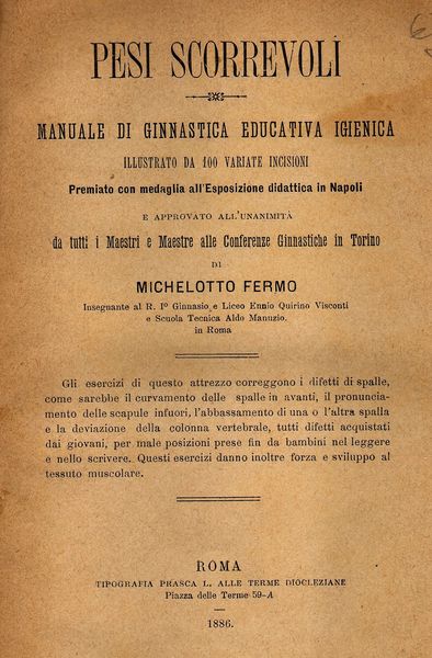 DA DE SANCTIS A FERMO, AVANGUARDIA DI SPORT E SALUTE – Puntualmente, si verifica quanto è nella logica delle cose e che sono prevedibili. Sulla crisi libica non abbiamo più niente da dire, se non che andrà di male in peggio. La semplice gestione delle risorse fossili di cui dispone risolverebbe ampiamente il problema di quella popolazione, ma altresì alimenta la cupidigia dei finti pacificatori. Così oggi preferisco rimettere mano alla cultura sportiva, prendendo lo spunto da un raro volumetto della mia raccolta in comodato al Centro Studi Documentazione e Ricerche “ALTIS” del CNIFP, il “Manuale di Ginnastica Educativa Igienica” del Maestro Michelotto Fermo, elaborato e pubblicato nel 1886 sull’onda della Legge De Sanctis del 1878, istitutiva della Ginnastica Educativa nelle Scuole elementari del Regno d’Italia. Al riguardo, voglio sottolineare come la Repubblica sia in un ritardo abissale e che il riavvio con l’Azienda dedicata, che ha sostituito CONI Servizi, presenta problematicità evidenti. Comunque, per dare una idea di quanto fossimo avanti, soprattutto nella scuola e di quanto abbiamo perso attraversando secoli e regimi diversi, vi rimando al testo ed alle immagini di quanto sopra…