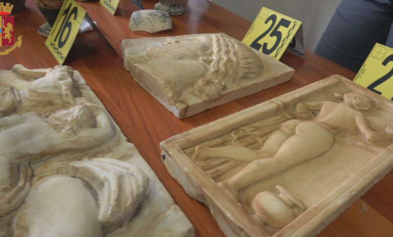 In un garage utilizzato dalla persona denunciata sono stati rinvenuti numerosi  vasi e anfore di grande interesse storico. In una successiva perquisizione presso l’abitazione  sono stati rinvenuti e sequestrati ulteriori oggetti di interesse storico quali: un mortaio, una coppa in pietra grigia, un vaso in pietra, una metopa rettangolare, una vasca in pietra, un basso rilievo raffigurante un volto e parti di figure maschili e femminili.