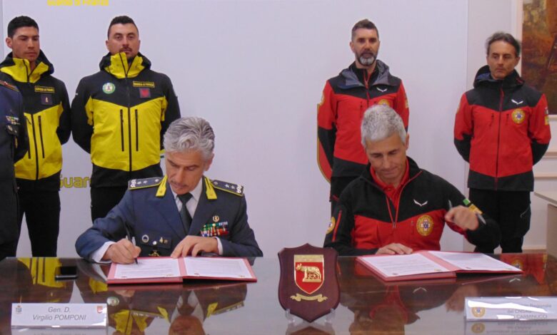 É stato firmato presso la caserma del Corpo “Ten. M.A.V.M. F. Arcioni”, sita in Roma, dal Comandante Regionale Lazio della Guardia di Finanza, Gen. D. Virgilio Pomponi e dal Presidente del Servizio Regionale Lazio del C.N.S.A.S., dott. Roberto Carminucci, un protocollo d’intesa volto a consolidare e potenziare la collaborazione tra i due attori principali impegnati in attività di soccorso in montagna e negli ambienti ostili e impervi.