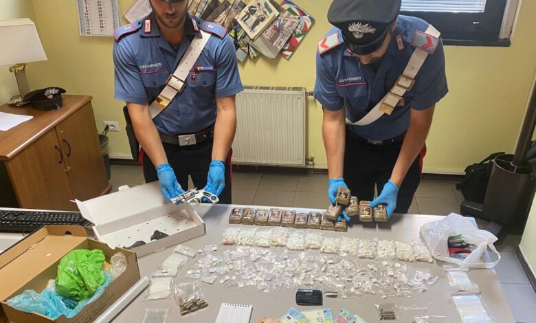 In largo Ferruccio Mengaroni, i Carabinieri della Stazione Roma Tor Bella Monaca hanno controllato un romano di 67 anni, con precedenti, mentre si stava aggirando, in atteggiamento sospetto, in una delle più note piazze di spaccio della zona. Le sue risposte evasive hanno convinto i militari ad estendere le verifiche in un garage sotterraneo della palazzina “A” che l’uomo aveva occupato abusivamente e adibito ad abitazione. In un vano attiguo, i Carabinieri hanno rinvenuto 14 panetti di hashish per un peso complessivo di circa 1,4 Kg e dei sacchetti contenenti 323 dosi singole di cocaina, per un peso complessivo di 171 g. Non solo: i Carabinieri hanno recuperato anche un involucro in cellophane al cui interno era custodita una pistola revolver “Smith & Wesson” 38 Special con 4 cartucce, altre 22 munizioni calibro 9×21, 5 munizioni calibro 9×38 e 170 euro di cui l’uomo non ha saputo fornire una valida giustificazione circa la provenienza. Il 67enne è stato portato in caserma poiché gravemente accusato di detenzione ai fini di spaccio, detenzione illegale di armi e munizioni e ricettazione. L’arma verrà inviata ai laboratori di balistica del R.I.S. per verificare se possa essere stata utilizzata in passati o recenti episodi di cronaca.