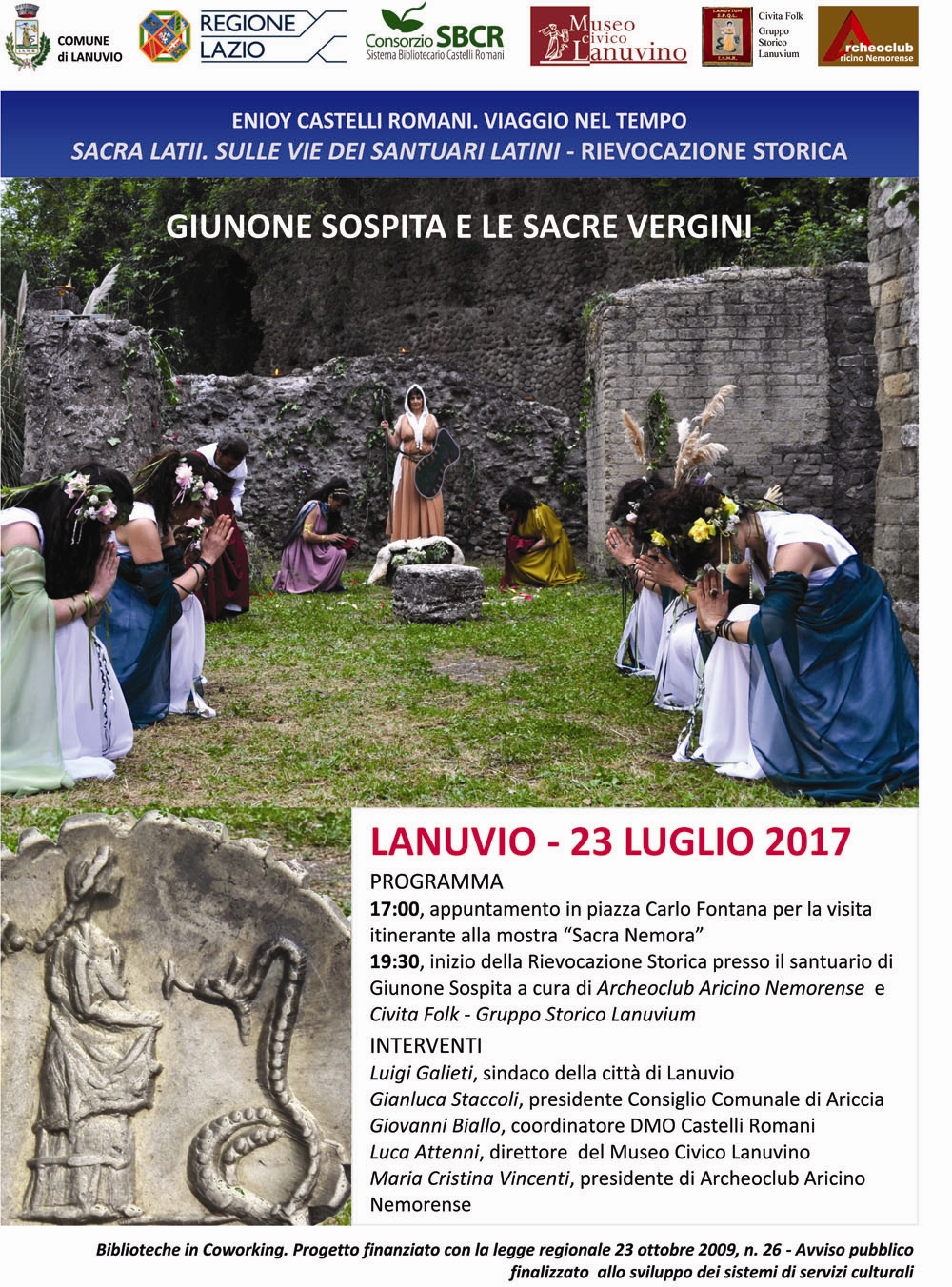A Lanuvio nella serata di domenica 23 luglio la rievocazione storica in costume latino “Giunone sospita e le sacre vergini” Lanuvio fu uno dei centri più importanti del Latium Vetus. Sulla sua antica acropoli sono ben visibili i resti del tempio di Giunone Sospita (“salvatrice”), dell’VIII secolo a.C., che occupano buona parte del Colle San Lorenzo, e parte della attuale villa Sforza-Cesarini.È qui che si terrà il clou dell’evento del 23 luglio, una delle tappe dei “Sacra Latii, sulle vie dei santuari dei Latini”, rievocazioni di cerimonie e preghiere in costume romano in luoghi del territorio in cui sorgevano antichi siti dedicati al culto.L’evento avrà inizio alle ore 17.00 in Piazza Carlo Fontana, dove si svolgerà la prima parte della visita guidata alla mostra in corso “Sacra Nemora. La cultura del sacro nei contesti santuariali in area Albana. Rinvenimenti archeologici e recuperi della Guardia di Finanza”. La seconda parte della visita riguarderà il pian terreno della Villa Sforza Cesarini e l’area archeologica del tempio di Giunone Sospita. Dopo i saluti delle autorità, alle 19.00 nell’area antistante il portico monumentale del santuario avrà inizio la rievocazione “Giunone Sospita e le sacre vergini” in costume latino lanuvino. L’Archeoclub Aricino Nemorense e Civita Folk – Gruppo Storico Lanuvium, in collaborazione con il Museo Civico Lanuvino, ricostruiranno il rito delle fanciulle vergini, legato a Giunone Sospita e ai riti di passaggio all’età adulta, attraverso le testimonianze degli autori antichi e le recenti scoperte archeologiche avvenute nell’enigmatico sito di Pantanacci, a pochi metri dalla via Appia Antica.La rievocazione, compresa nel progetto “Biblioteche in Coworking”, si inserisce nel circuito “Viaggio nel tempo”, che propone eventi di spessore gratuiti e aperti a tutti per illuminare scorci del territorio castellano nelle diverse epoche storiche, tra cui il passato romano e preromano. Le manifestazioni, finanziate dalla Regione Lazio, sono promosse dal Consorzio per il Sistema Bibliotecario dei Castelli Romani (SBCR) in collaborazione con le amministrazioni comunali e le associazioni culturali.
