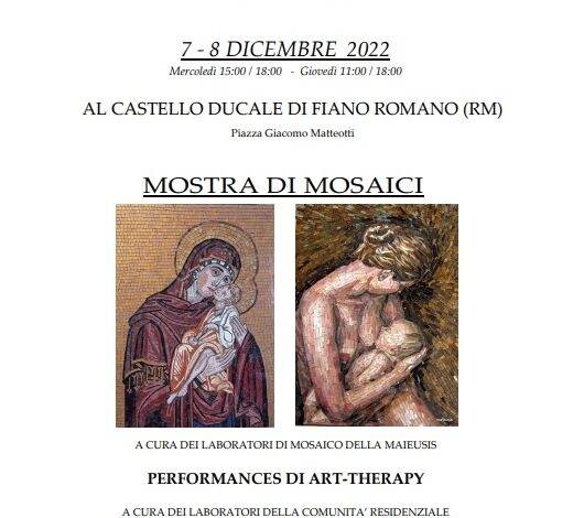 Un’esposizione di mosaici e dipinti realizzati da ragazzi con patologie psichiatriche con l’obiettivo terapeutico di rafforzare il percorso di reinserimento sociale attraverso un progetto inclusivo che coinvolge in prima persona la comunità locale di riferimento. La mostra di mosaici, a cura dei laboratori di Maieusis, si terrà mercoledì 7 e giovedì 8 dicembre presso la cornice del prestigioso Castello Ducale di Fiano Romano, in piazza Giacomo Matteotti.
