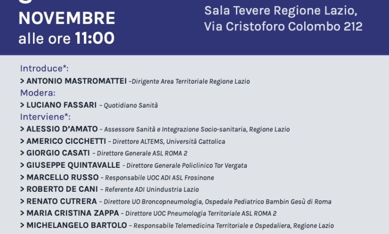 Il programma. Ad introdurre i lavori del convegno sarà Antonio Mastromattei (Dirigente Area Territoriale Regione Lazio). A seguire, gli interventi di Alessio D’Amato (Assessore Sanità e Integrazione Socio-sanitaria Regione Lazio), Americo Cicchetti (Direttore ALTEMS, Università Cattolica), Marcello Russo (Responsabile UOC ADI ASL Frosinone), Giorgio Casati (Direttore Generale ASL ROMA 2), Roberto De Cani (Referente ADI Unindustria Lazio), Renato Cutrera (Direttore UO Broncopneumologia, Ospedale Pediatrico Bambin Gesù di Roma), Maria Cristina Zappa (Direttore UOC Pneumologia Territoriale ASL ROMA 2), Michelangelo Bartolo (Responsabile Telemedicina Territoriale e Ospedaliera, Regione Lazio), Giuseppe Quintavalle (Direttore Generale Policlinico Tor Vergata). Nel corso del convegno, i cui lavori saranno moderati dal giornalista Luciano Fassari, verranno diffuse anche video testimonianze di alcuni pazienti assistiti a domicilio dalla Regione Lazio.