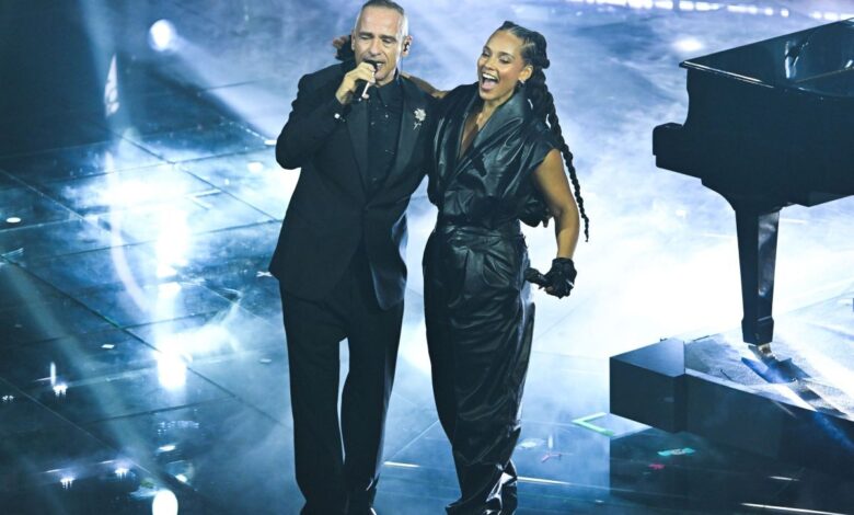 Per il momento sociale Carlo Conti accoglie l’appello di Paolo Sarullo, ragazzo di Albenga aggredito da quattro adolescenti che per rubargli il monopattino l’hanno spinto e fatto cadere lasciandolo tetraplegico. “Stop alla violenza sui giovani”, dice. Aggiungendo: “Non si molla un cazzo”, promettendo di impegnarsi nella riabilitazione. Superospite Eros Ramazzotti che 40 anni fa vinceva il Festival con “Adesso tu”. Con lui Alicia Keys: risolti i problemi tecnici cantano insieme “L’aurora” in duetto, facendo emozionare l’Ariston, e poi, da sola, la superstar intona “Empire state of mind” sostituendo New York con Sanremo. A far ridere contribuiscono Ubaldo Pantani che, nei panni di Lapo Elkann, tra battute (“Mettere il grande Max Pezzali sulla nave a largo mi sembra troppo, ma fatelo attraccare, vi prego”) e volute gaffe una dietro l’altra: da Rai9 a la Città dei Fiordi. Virginia Raffaele e Fabio De Luigi, in promozione del loro film “Un bel giorno” in uscita il 5 marzo, sono polistrumentisti improvvisati. Dai palchi esterni, i The Kolors al Suzuki Stage, e sempre Max Pezzali sul palco galleggiante della Costa Toscana. In platea il ct del volley azzurro maschile, Fefè De Giorgi, 3 mondiali da atleta e 2 da allenatore, invita all’Europeo che si giocherà in Italia al via a Napoli in piazza del Plebiscito il 10 settembre.