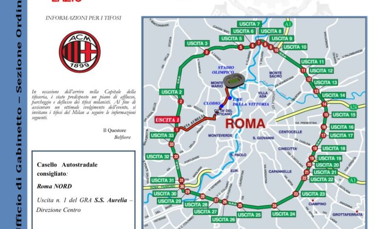 In occasione dell’incontro di calcio tra la S.S. Lazio e l’A.C. Milan, in programma domani 24 gennaio alle ore 20.45 presso lo stadio Olimpico, la Questura di Roma ha stilato una brochure per consentire ai tifosi un agevole afflusso all’impianto sportivo.