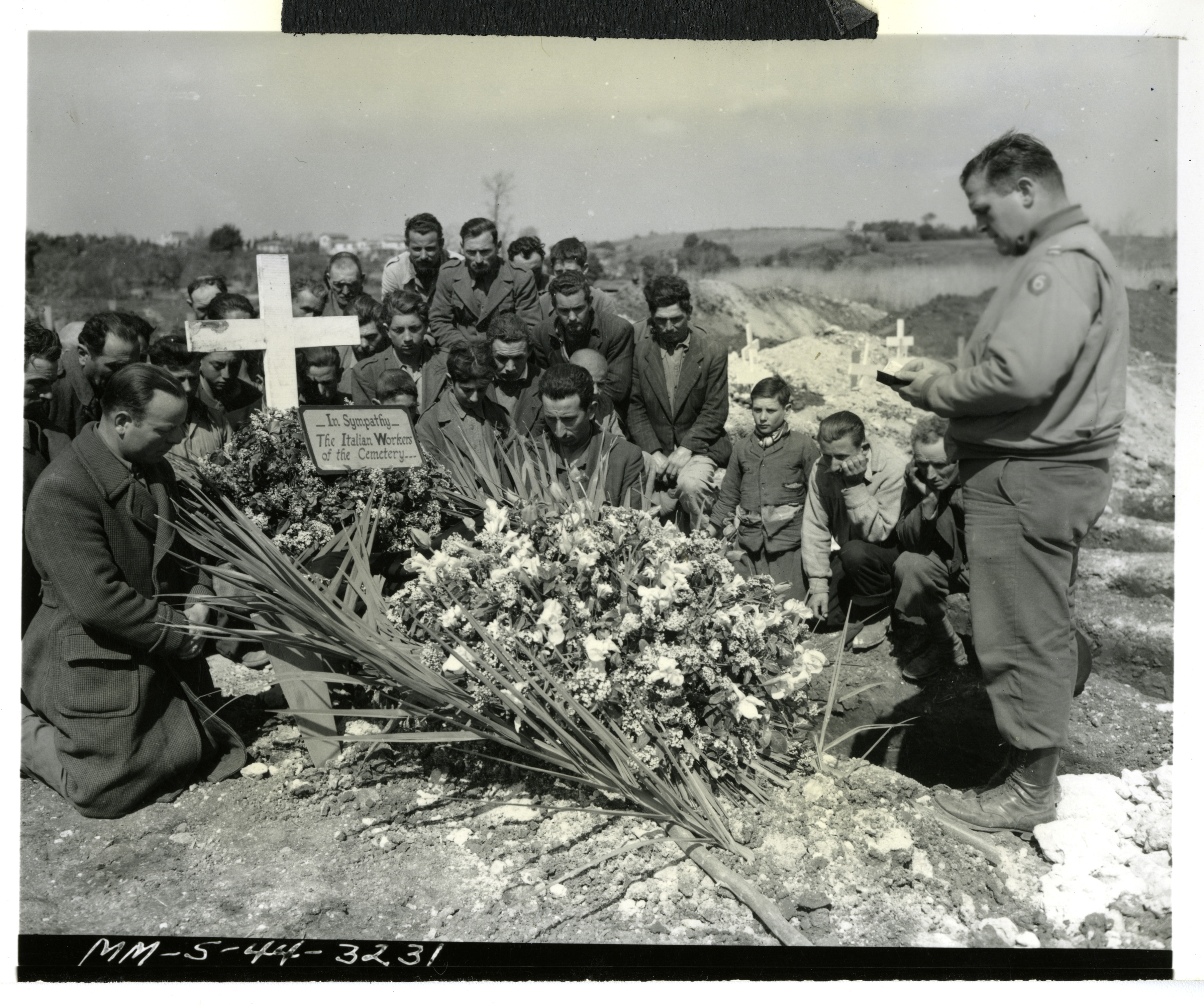 Maggio 1944 – Un gruppo di lavoratori del Sicily‐Rome American Cemetery omaggia la memoria di un caduto statunitense in occasione del Memorial Day.