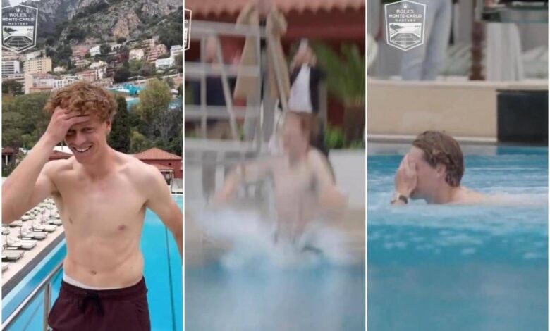 Prima però qualche momento di esitazione, con Sinner che ha chiesto a Vagnozzi, anche lui in costume pronto a tuffarsi, quanto fosse alto: “Tuffati di testa”, il consiglio, poco raccomandabile vista l’altezza, dell’allenatore. Sinner, per fortuna, non lo ha ascoltato e ha optato per una classica ‘candela’, celebrando così il trionfo di Montecarlo. A guardare il tutto, appoggiato a una colonna a bordo piscina, proprio Alcaraz.