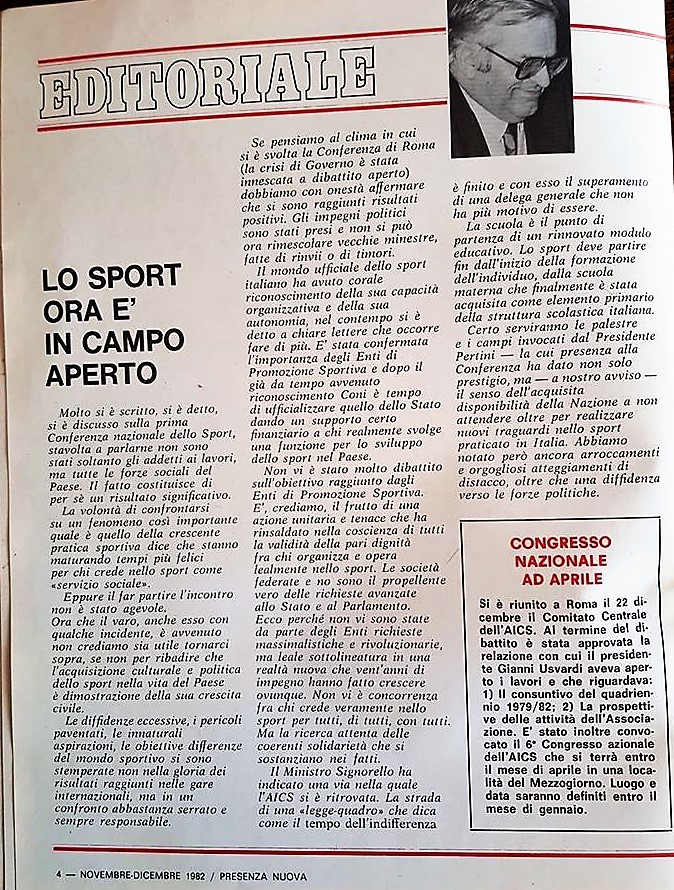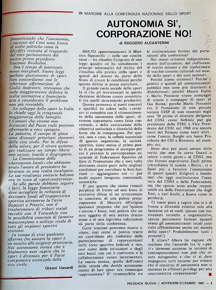 Proprio oggi, il Ministro dello Sport, Vincenzo Spadafora, ha voluto coinvolgere in modo concreto tutti i coattori impegnati nel vasto ed articolato panorama del fenomeno sportivo, in quella che sarà a sua cura la stesura dei Decreti attuativi della Legge delega sullo Sport. E sì, dunque mettiamoci all’opera, facendo leva sui corsi ed i ricorsi di storica memoria. Pensa che ti ripensa, ravanando tra gli editoriali di Presenza Nuova nel novembre del 1982, ho ripescato quello di Gianni Usvardi, “LO SPORT ORA E’ IN CAMPO APERTO” e il mio “AUTONOMIA SI’, CORPORAZIONE NO”, scritti all’indomani della Conferenza Nazionale dello Sport, organizzata dall’allora Ministro del Turismo con delega allo Sport, Nicola Signorello nella sede di Confindustria all’EUR. Devo confermare che allora l’aria che tirava tra i millecinquecento partecipanti era proattiva, positiva e se gli stessi beneficiari della riforma CONI e Federazioni, non si fossero messi stupidamente di traverso con il supporto della stampa sportiva che cavalcava l’antico slogan de “Lo Sport Agli sportivi”, oggi la pratica motoria nel nostro Paese, nella scuola e nei territori, avrebbe un profilo sicuramente diverso, molto più vicino a quel concetto di qualità della vita che ora continuiamo a invocare. Quella fu la vera grande occasione del secolo scorso, in cui immettere direttamente la sapienza e l’esperienza del mondo sportivo in una Legge dello Stato sarebbe stato già possibile. Oggi, siamo in attesa dei Decreti Attuativi della Legge Delega approvata in Parlamento e firmata dal Capo dello Stato l’8 agosto dello scorso anno, Decreti della cui elaborazione si sta occupando il Ministro Vincenzo Spadafora con il suo staff. Siamo fiduciosi nelle buone intenzioni, ma l’Associazionismo Sportivo è pronto alla chiamata? L’Associazionismo comunque impegnato nella elaborazione di progetti suscettibili di finanziamento pubblico e mirati alla ripartenza post COVID 19 dovrà doppiare lo sforzo di quì al 30 di giugno e poi ancora sino al 7 luglio. E poi e poi ce la faremo come sempre. E’ un momento un po’ così…