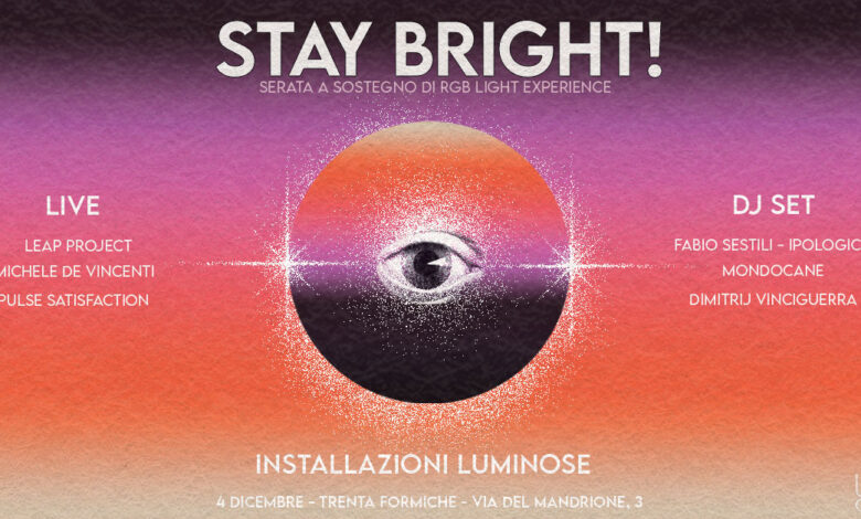 La prossima  edizione si terrà tra il 16 e il 18 dicembre, ma prima di svelare il nuovo programma, domenica 4 dicembre al Trenta Formiche si terrà “STAY BRIGHT!” una serata a sostegno di RGB Light Experience, un primo evento speciale targato RGB che ci condurrà nel suo mondo.