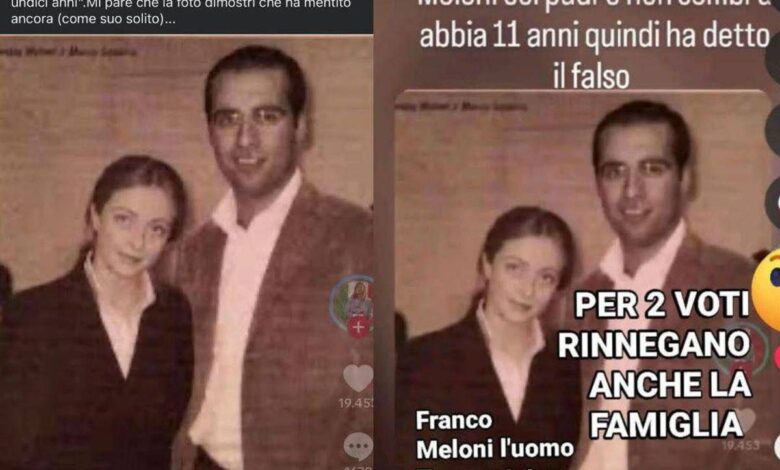 Insieme allo scatto, scritte tese a sostenere che non corrisponderebbe al vero la chiusura dei rapporti tra i due quando l’attuale premier era ancora una bambina. “Meloni e suo padre: ‘Ho rotto i rapporti con lui da quando avevo 11 anni’. Mi pare che la foto dimostri che ha mentito (come al suo solito)”, si legge in uno dei post sopra la foto. “Meloni col padre – indica un altro post – non sembra abbia 11 anni quindi ha detto il falso”, è l’attacco di un altro utente.
