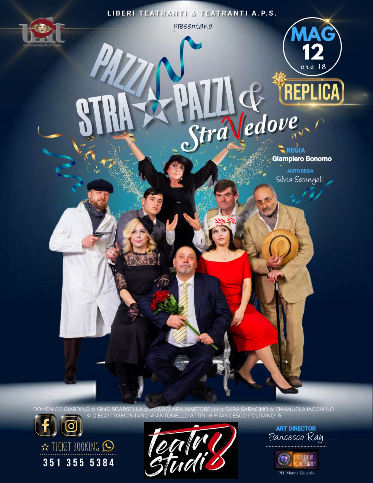 Il 13 e 14 aprile scorso, l’Associazione di promozione sociale “Liberi Teatranti & Teatranti”, hanno dimostrato ancora una volta di essere un gruppo unito e coeso che fabbrica sogni e buon umore, tranquillità e serenità con la sua variegata attività culturale e sociale. L’ironia e la leggerezza della nuova commedia dalle venature divertenti con sfondo vedovile, scritta e diretta da Giampiero Bonomo, dal titolo “Pazzi, straPazzi e StraVedove”, ha registrato un doppio “Sold Out” al Teatro Studio 8 di Nettuno.