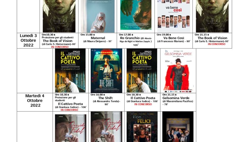 Saranno dieci le opere selezionate che concorreranno per i premi tecnici. Tre, invece, i titoli che concorreranno per il primo premio, il cosiddetto Premio Cinema Giovane, attribuito dal pubblico e dagli studenti del Progetto di Educazione al Cinema d’Autore e dei PCTO (Percorsi per le Competenze Trasversali e l’Orientamento) e per il Premio per Opera Preferita dagli Studenti (assegnato da una giuria composta da soli studenti): l’ambizioso e visionario The Book of Vision di Carlo S.Hintermann; il decadente ritratto dannunziano Il cattivo poeta di Gianluca Iodice; l’originale e brillante commedia Querido Fidel di Viviana Calò.