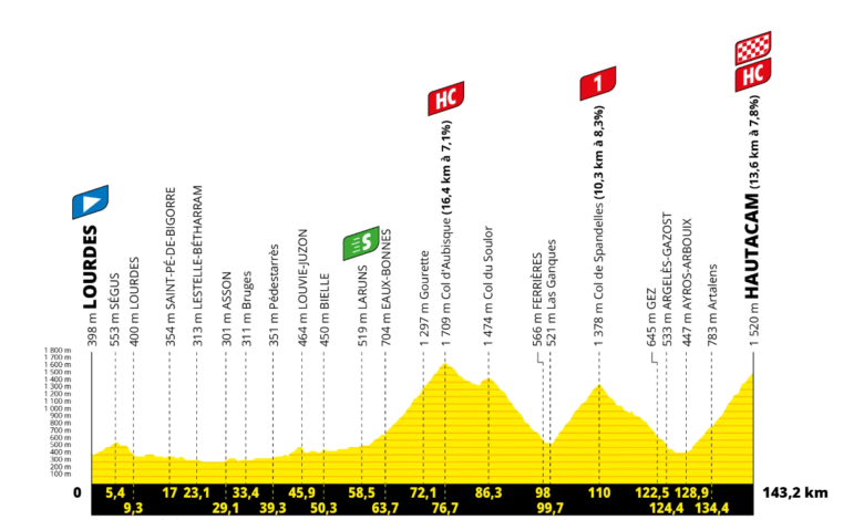 La diciottesima tappa del Tour de France concluderà la “campagna” pirenaica. Chi ha intenzione di conquistare la maglia gialla dovrà attaccare Jonas Vingegaard della Jumbo-Visma. La carovana partirà da Lourdes per raggiungere Hautacam dopo 143,2 chilometri. Anche questa frazione di questa edizione della Grande Boucle è divisa in due parti: una molto tranquilla col traguardo di Laruns posto dopo 60 chilometri. Le prime difficoltà per i ciclisti saranno sul Col d’Aubisque lungo 16,4 chilometri con pendenze del 7,1% che metterà a dura prova le gambe degli scalatori. Dopo una lunga discesa, i corridori torneranno a salire e scollineranno sul Col de Spandelles lungo 10.3 chilometri con pendenze medie dell8.3%. Infine per raggiungere Hautacam gli atleti dovranno salire per 13,6 chilometri con pendenza medie del 7,8% e punte anche sopra il 10%.