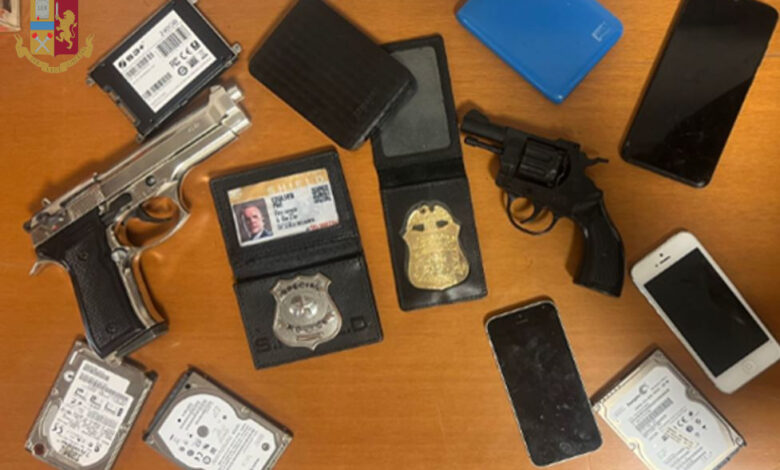 Su delega della procedente Procura capitolina si procedeva a perquisizione locale e personale nei confronti del soggetto indagato, rinvenendo e successivamente sequestrando devices e materiale predisposto per simulare l’appartenenza ad un corpo di polizia, in particolare due pistole replica senza il previsto tappo rosso di sicurezza e due portatessere con placche metalliche riconducibili all’agenzia governativa americana FBI.