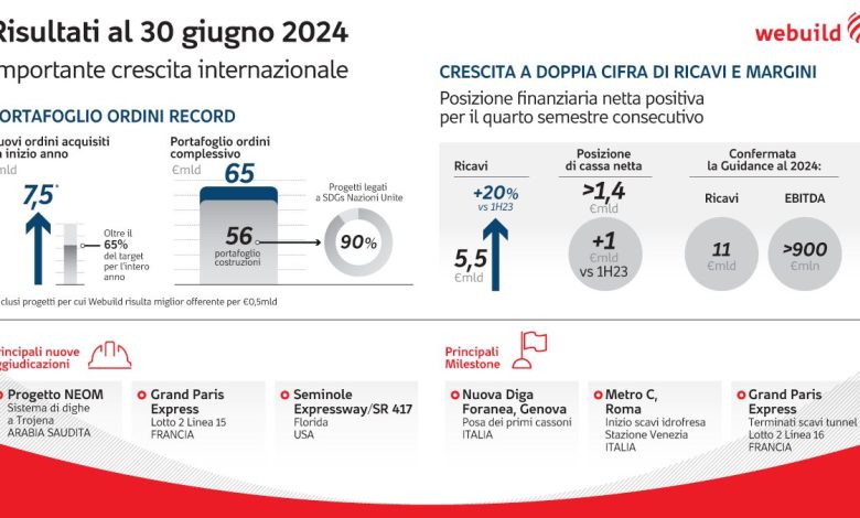 MILANO (ITALPRESS) – Il Consiglio di Amministrazione di Webuild ha approvato la Relazione finanziaria semestrale consolidata al 30 giugno 2024 nonchè esaminato i “Dati Consolidati Adjusted”, al fine di comparare l’andamento gestionale su base omogenea.